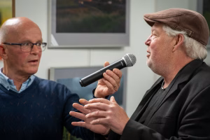 Mensen op straat Een vrouw met bril draagt een oranje jas en zit op een stoel naast een tafel met een zwart-wit foto van twee mensen die aan het breien zijn. Eigenlijk Dierenarts met hond en klant Woede Helderziende en de toekomst In gedachten Ik zie je Hond uitlaten 3 Hond uitlaten 2 Hond uitlaten 1 Fotograaf Dat is leuk Onenigheid Op Koningsdag De leukste nicht Vrolijke kunstenares